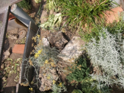 Außerdem habe ich größere Steine, Korkrinde und Wurzeln ins Gehege eingebracht, bewährt hat sich vor allem Kalksplitt, der in Kombination mit Deckung bietenden Pflanzen gerne von den Tieren zum morgendlichen Aufwärmen genutzt werden. Um eine zu schnelle Verunkrautung zu vermeiden, habe ich unter dem Kalksplitt ein Gartenflies ausgelegt.