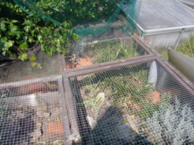 Gehege für Nachzuchten, abgedeckt mit Drahtrahmen und Blick in das Jungtiergehege